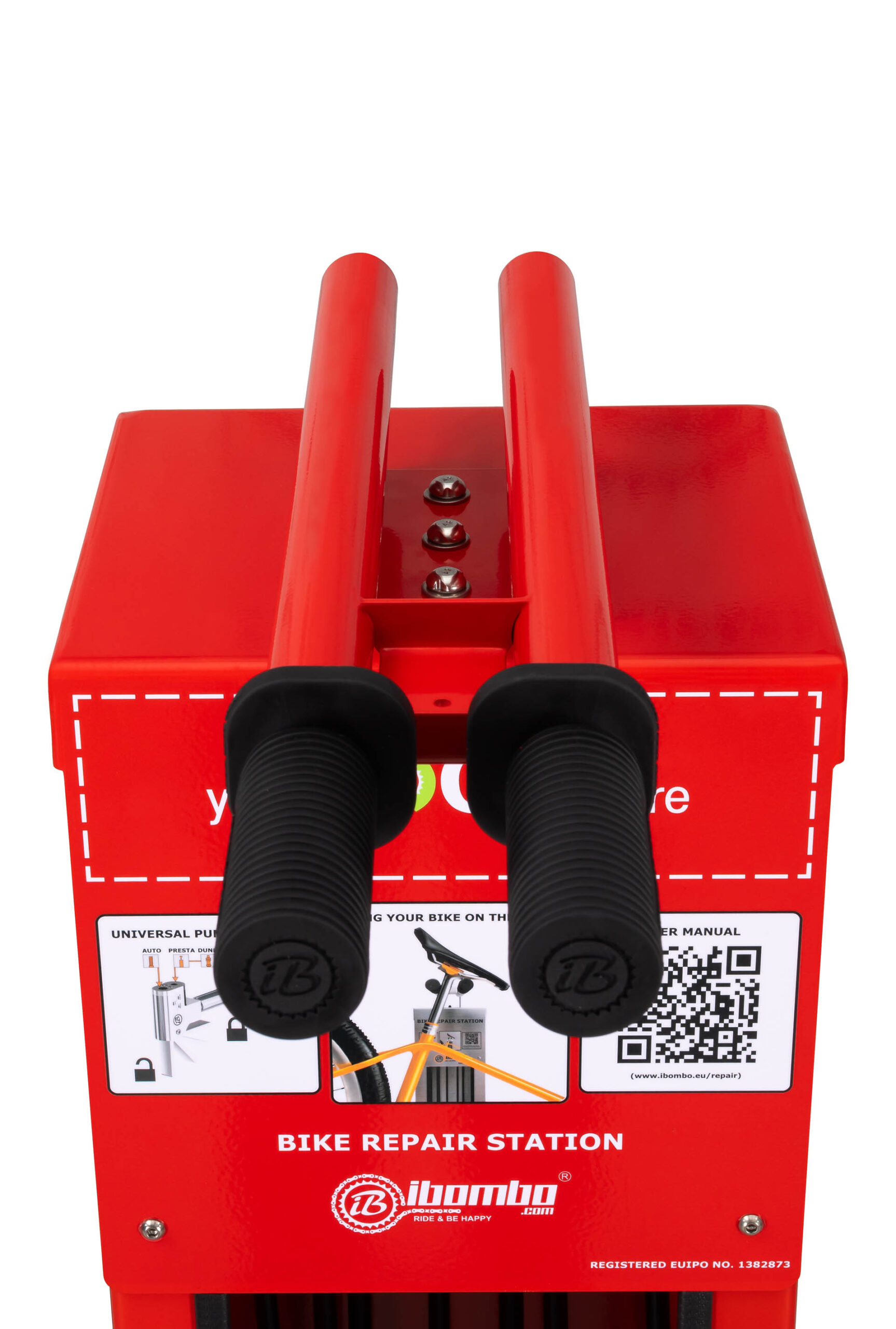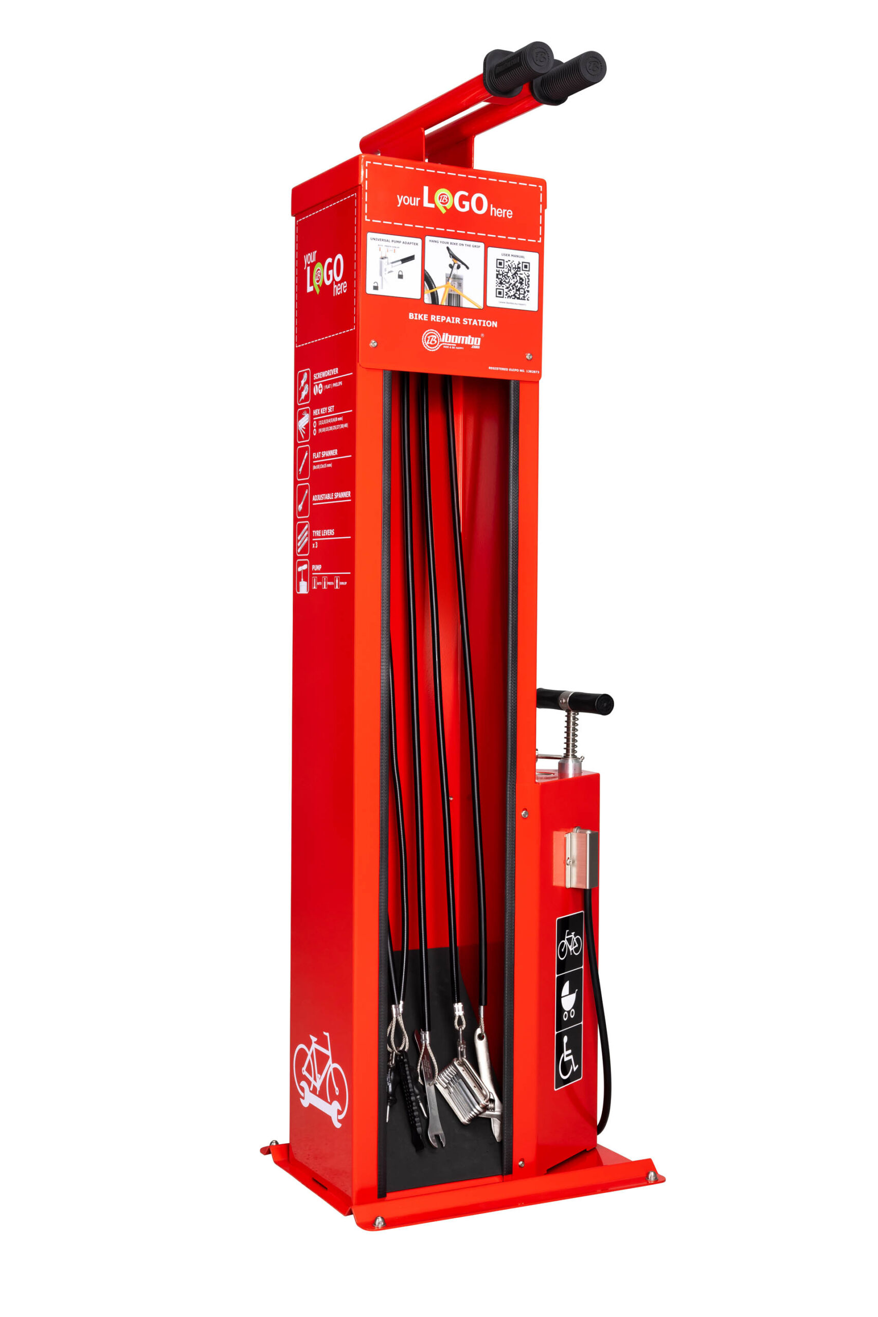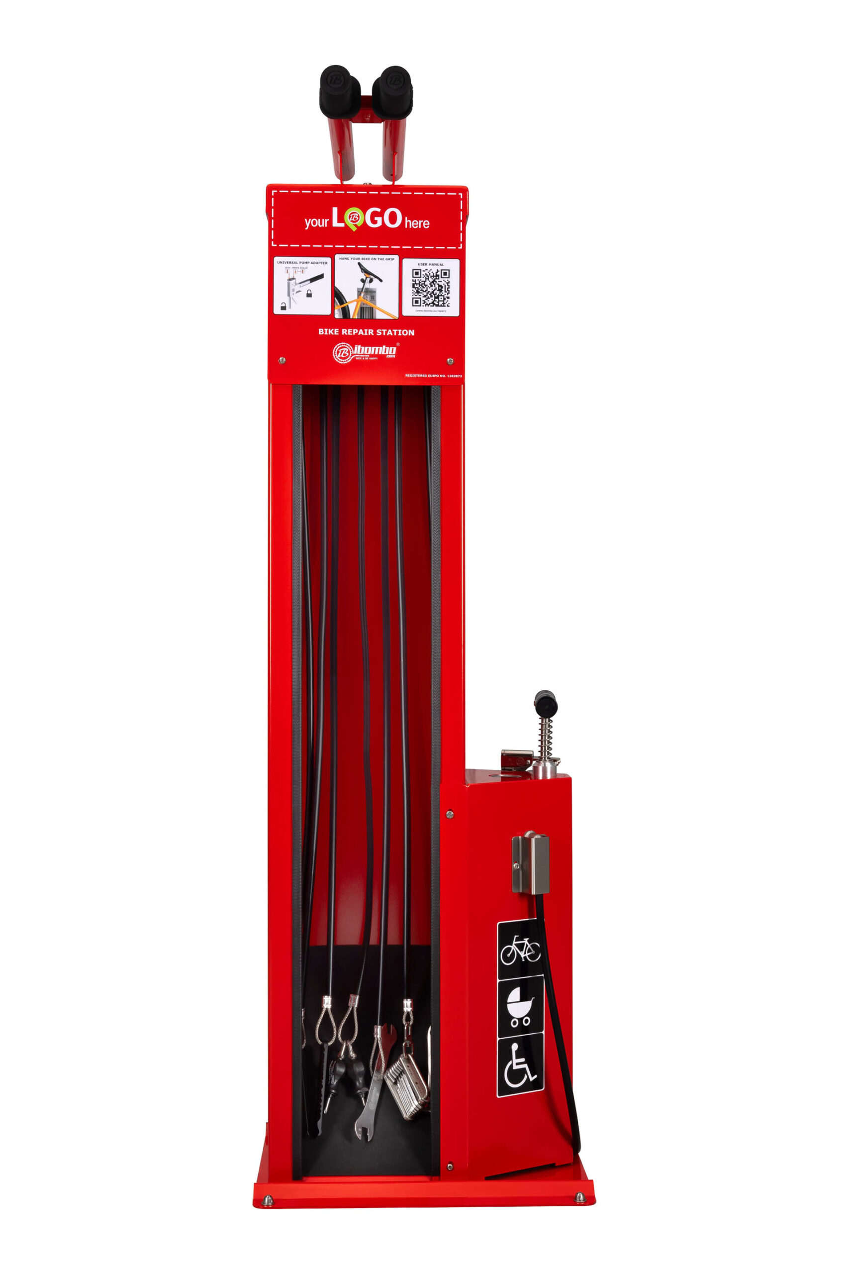 Self-Service Bike Repair Station – IBOMBO PRS-LV2 er tilpasset til brug i offentlige rum. Apparatets hus er lavet af galvaniseret eller rustfrit stål med pulver- eller termoplastbelægning. Apparatet monteres til jorden eller væggen ved hjælp af ankre.