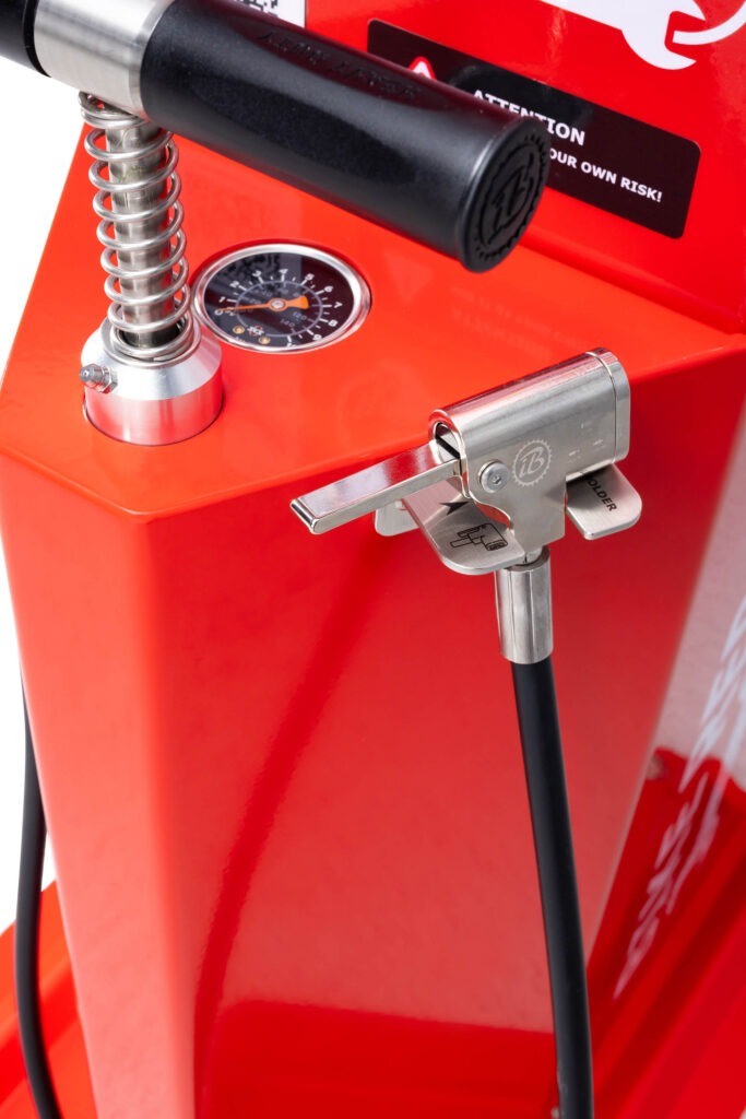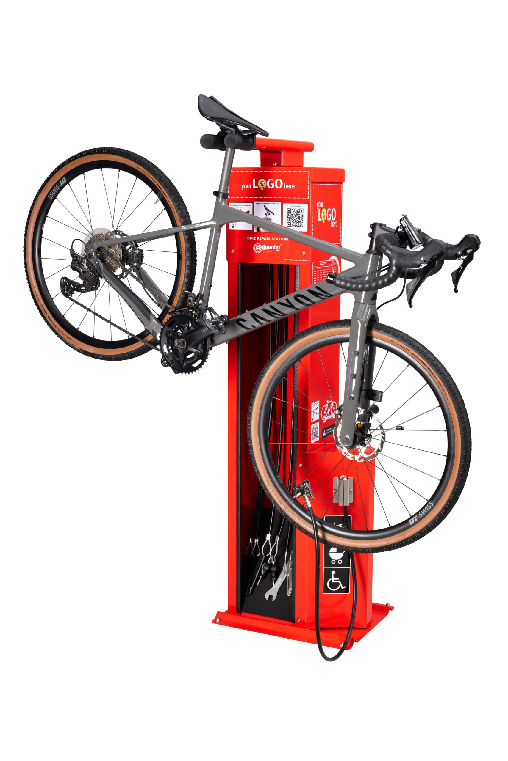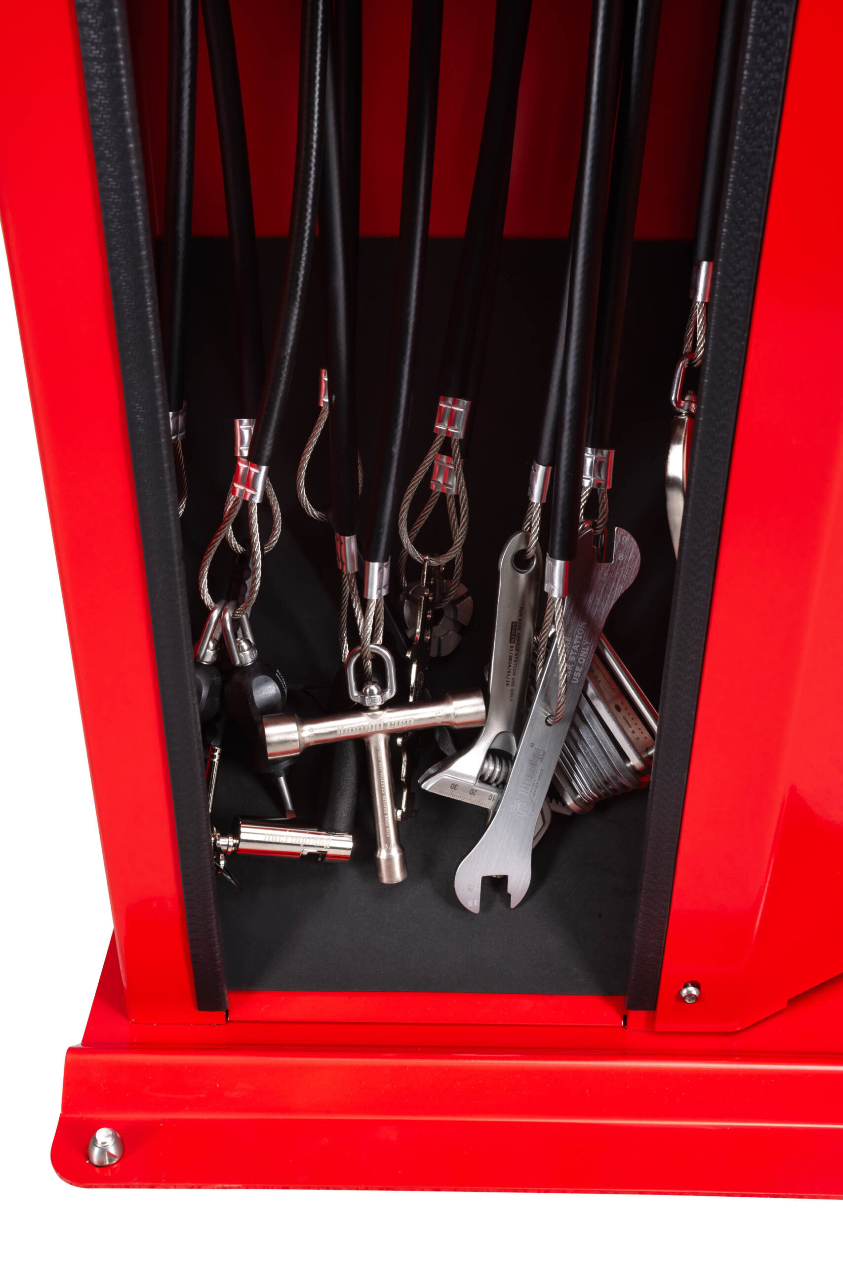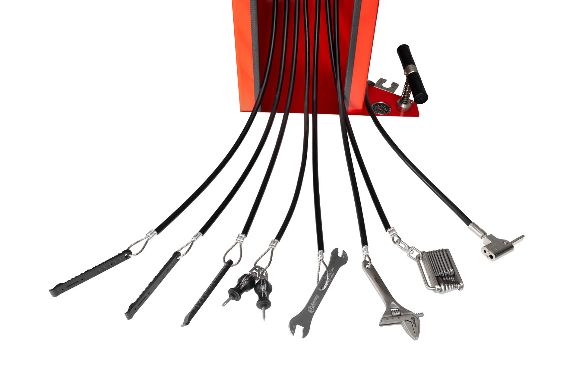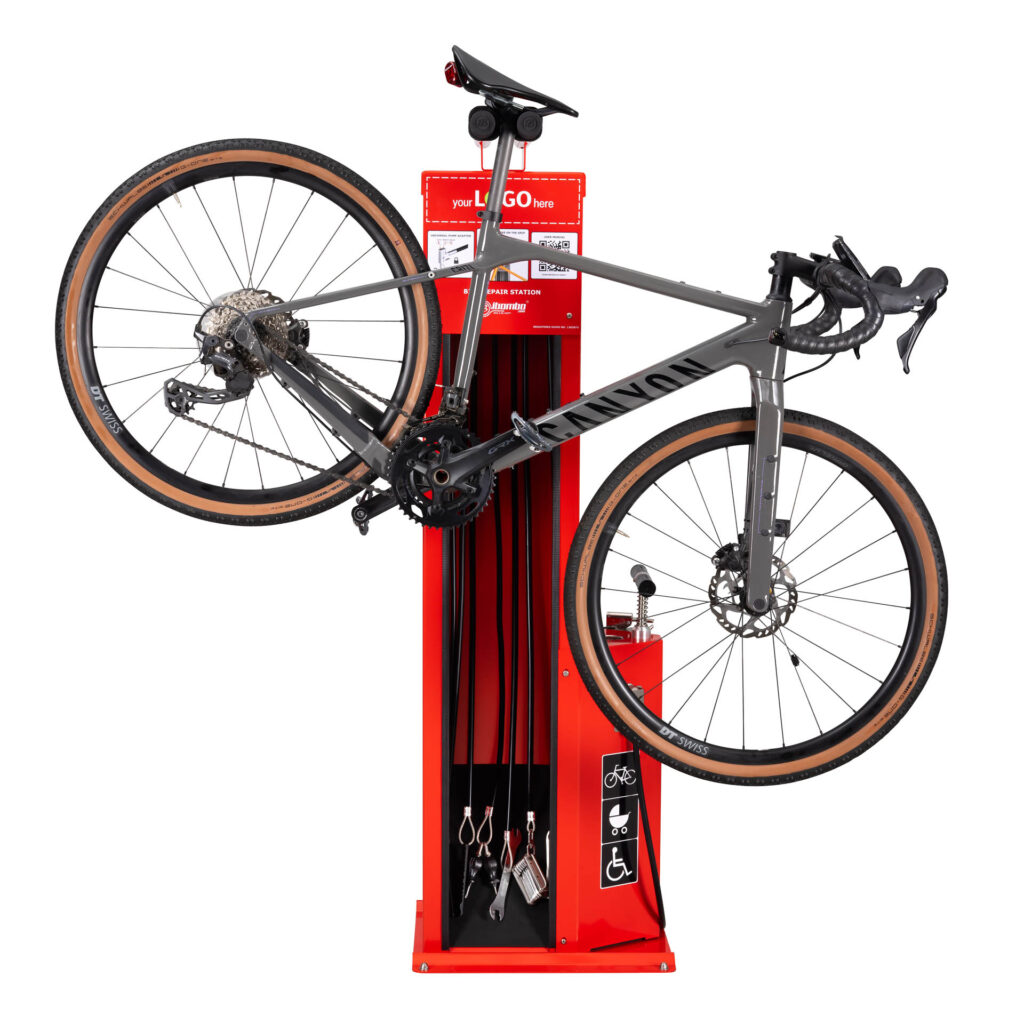 Værktøjerne er fastgjort til de rustfri stålreb, der hænger inde i stationens søjle; længden af rebene giver dig mulighed for at nå alle cykelkomponenter. Gummibelægningen af rebene forhindrer værktøj i at blive filtret og beskytter cykelstellet mod ridser. Stationens konstruktion gør, at du kan placere cyklen på grebet, så du nemt kan dreje håndsvinget, mens du reparerer cyklen. Stationen er udstyret i en håndpumpe med adapter til alle ventiltyper.