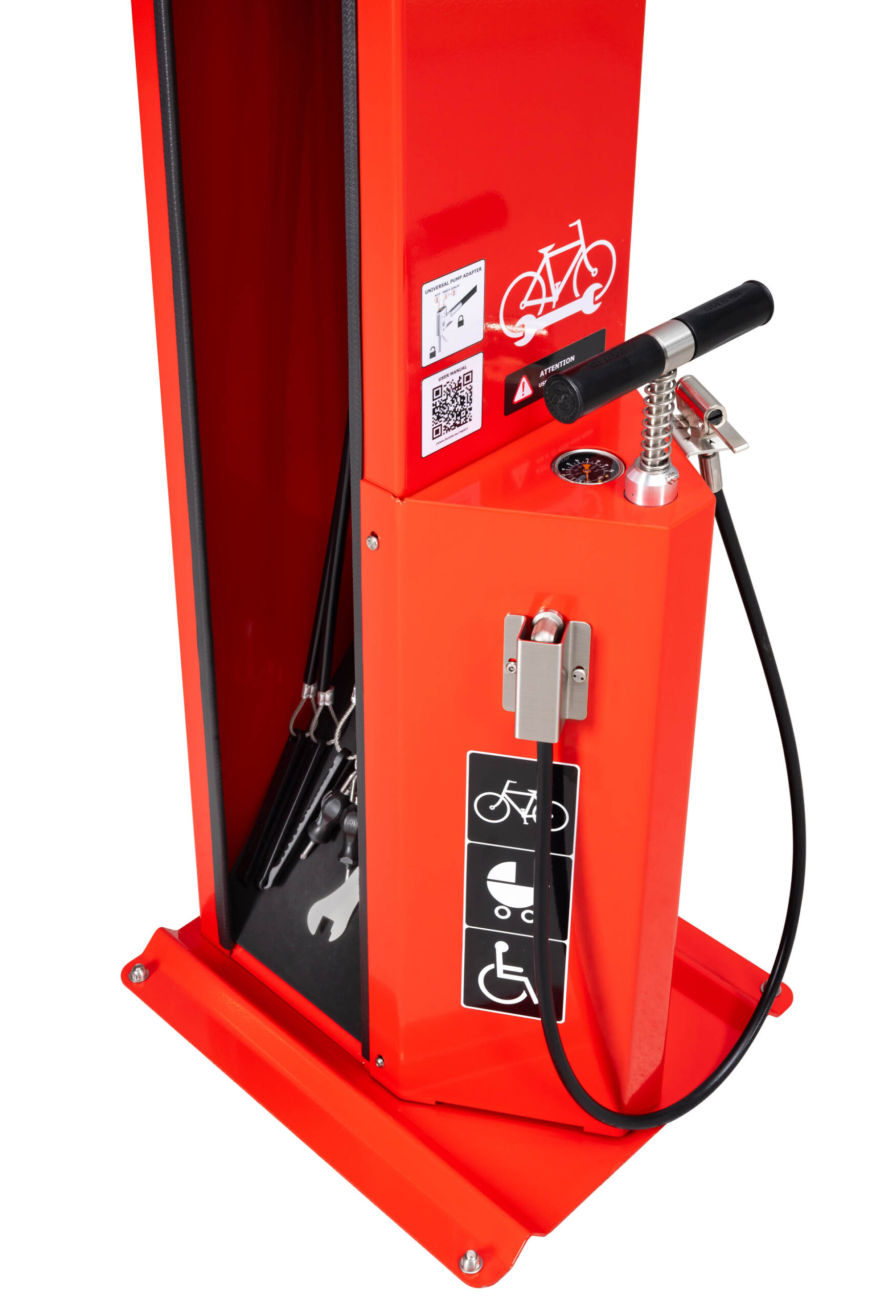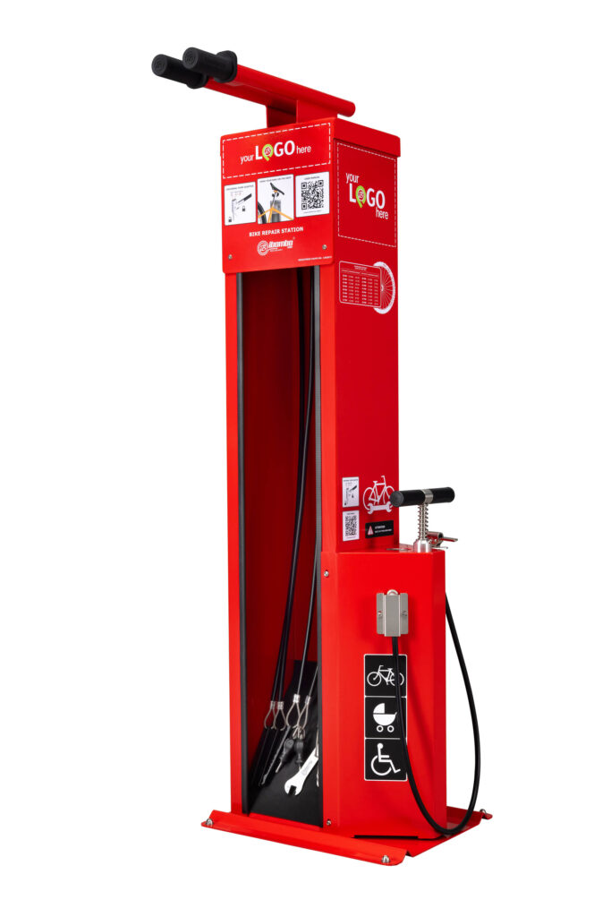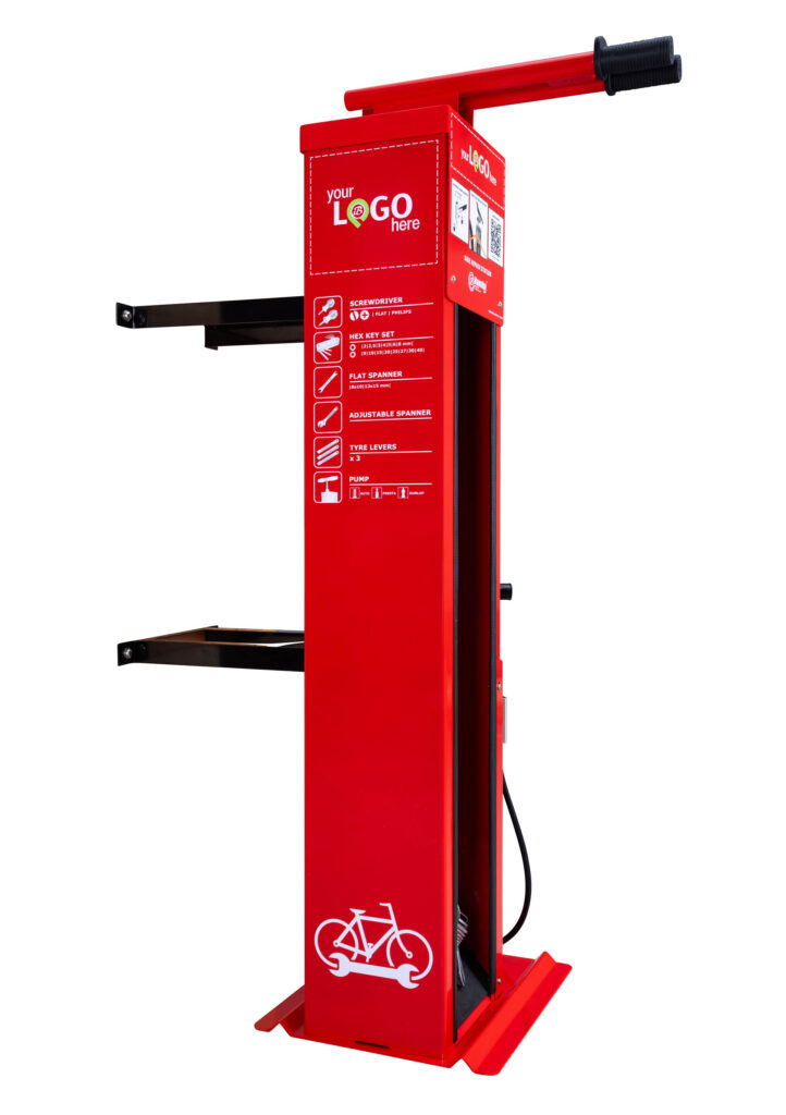 QR-KODE placeret på forsiden af stationen giver dig mulighed for at bruge online publikationer, der indeholder instruktioner om reparation af cykelfejl. Pladeelementer af enheden er fastgjort med tyverisikringsskruer – bitsene til disse skruer vil blive overdraget til kunden. Denne model af stationen kan desuden udstyres med blandt andet vandtætte aluminiumsstel, side-eller-ryg cykelstativ, en pneumatisk skateboardholder eller E-BIKE cykelopladningsmodul.