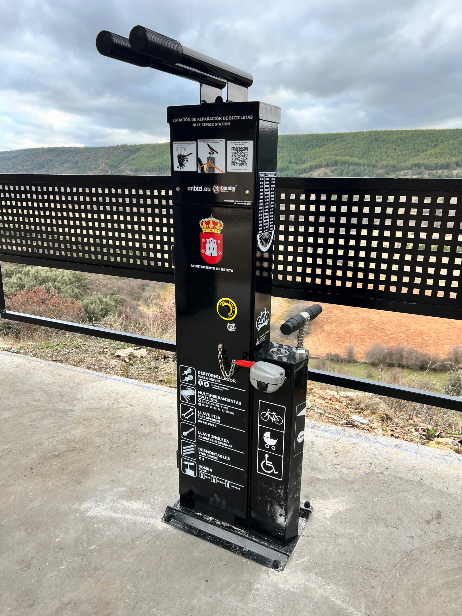 Værktøjerne er fastgjort til de rustfri stålreb, der hænger inde i stationens søjle; længden af rebene giver dig mulighed for at nå alle cykelkomponenter. Gummibelægningen af rebene forhindrer værktøj i at blive filtret og beskytter cykelstellet mod ridser. Stationen er udstyret i en håndpumpe med adapter til alle ventiltyper. Stationens konstruktion gør, at du kan placere cyklen på grebet, så du nemt kan dreje håndsvinget, mens du reparerer cyklen.